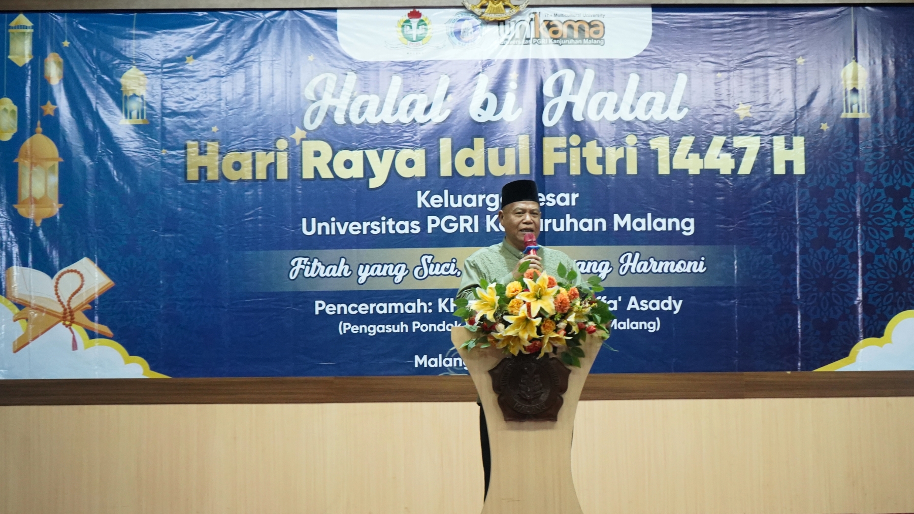 UNIKAMA – Suasana penuh kekhidmatan dan kebersamaan menyelimuti Aula Auditorium Universitas PGRI Kanjuruhan Malang (UNIKAMA) pada Jumat, 27 Maret 2026. Seluruh Civitas Akademika, tenaga pendidik, serta jajaran pengurus yayasan berkumpul dalam acara Halal Bihalal Hari Raya Idul Fitri 1447 H. Mengusung tema “Fitrah yang Suci, Unikama yang Harmoni”, acara ini menjadi momentum awal transformasi besar institusi menuju pencapaian yang lebih gemilang.